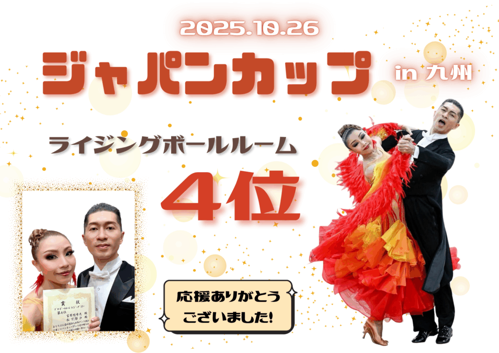 ホーム > 新着情報 > 競技会結果 > 2025.10.26【ジャパンカップin九州】結果 競技会結果 2025.10.26【ジャパンカップin九州】結果 投稿日:2025年10月28日 更新日: 2025年11月10日(月) 2025年10月26日【ジャパンカップin九州】ライジングボールルームで4位入賞いたしました! 今年はこれにて遠征終了。 次回は11/16に【イーストジャパン選手権大会】に出場します。 ●イーストボールルーム ●BCDN級ボールルーム ●トゥインクルボールルーム の3セクションに出場し、さらに松下は【ラテンダブルスフォーメーション】も踊ります! チケットはまだ販売中! ぜひ応援よろしくお願いいたします♪ 次の記事 前の記事